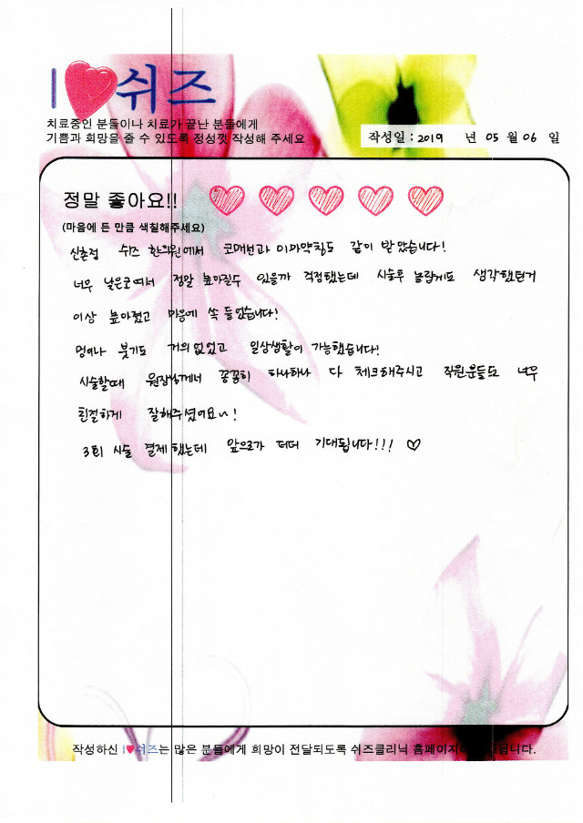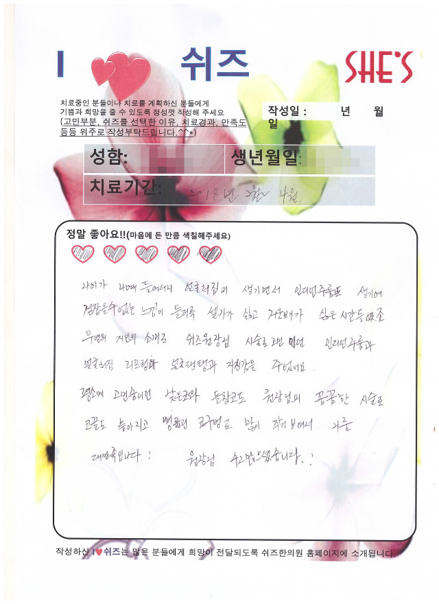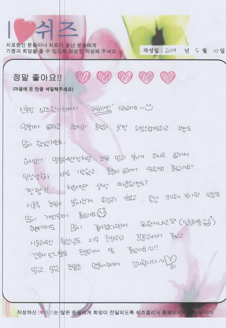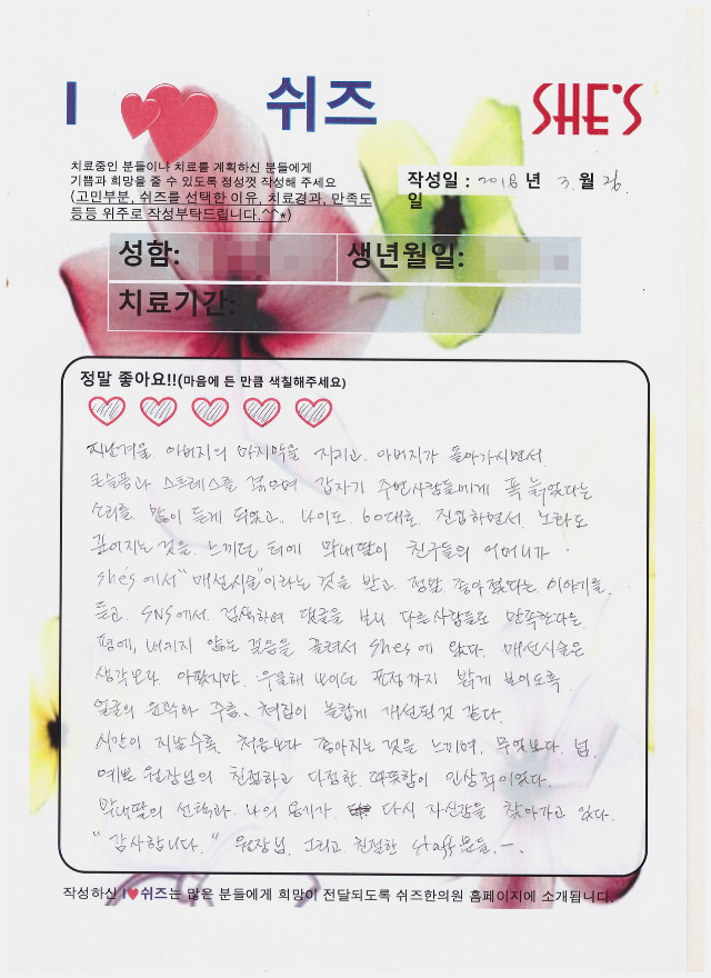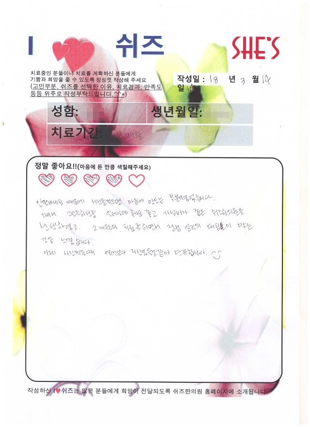 치료후기 [코매선][이마약침]시술 후 친필후기입니다 질환명: 한방얼굴성형 치료전: 낮은코 [눈밑매선]치료후기입니다. 질환명: 한방얼굴성형 치료전: 다크, 어두운 인상 20대 안면비대칭 교정 후기 질환명: 한방얼굴성형 치료전: 안면비대칭 60대 얼굴리프팅 친필후기 질환명: 한방얼굴성형 치료전: 피부주름,처진얼굴 40대 얼굴리프팅 친필후기 질환명: 한방얼굴성형 치료전: 처진얼굴, 낮은코 [코] [팔자주름] [볼꺼짐] 친필후기입니다. 질환명: 한방얼굴성형 치료전: 팔자주름 고민 23